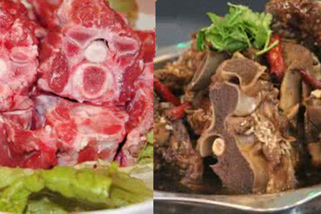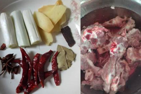 首先,准备的食材有新鲜的羊蝎子,调味的佐料有辣椒、八角、姜片、大葱、香叶。