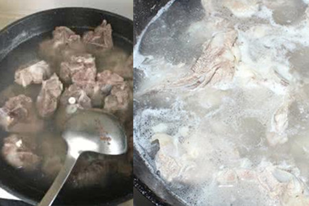其次,把洗净的羊蝎子放入装了适量水的锅中,大火煮至水开冒泡。水沸腾后,用漏勺把面上的浮沫打捞干净,放入适当的料酒。再往锅中加入生抽和酱油、盐。搅拌均匀使羊蝎子充分吸味,口感更好。