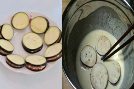 首先准备好材料:长茄子,事先已经剁好的肉沫,少许葱花和姜末,面粉和淀粉,适量的清水、油、酱油、料酒和香油,还有盐。接着,根据个人的胃口大小来自行选择要制作多少炸茄盒,就把多少茄子拿出来洗干净,并横着切成一段段,可以横着切或竖着切,只要不切断就可以了。同时调面糊和肉末,一定要注意面粉和淀粉的比例,将面粉和淀粉按照根据比例放到碗里,并倒入清水和香油,用筷子搅拌成面糊。
