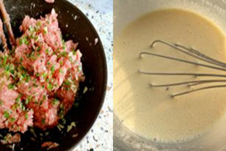 调肉末,依次往肉末里倒入香油、酱油、葱花和姜丝并搅拌均匀。然后就是把调好的肉末放进半开的茄子那里,再者把它小心放进调好的面糊那里,要将其完全浸透再取出。