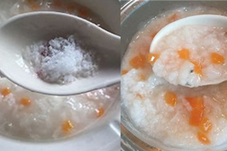 第八步,等粥煮到七成熟时,把已经捣碎的鳕鱼放入锅中搅拌均匀和其他材料一起煮。