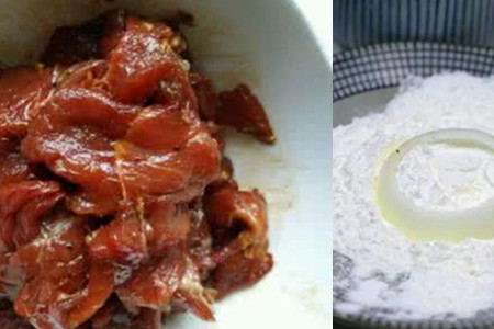 2、把洋葱剥去外皮,放在水龙头下洗净后切成小块,放在生粉里蘸一下,使洋葱均匀地裹上一层生粉。总所周知,切洋葱时洋葱会散发一种有挥发的物质,使眼睛不停地流泪。