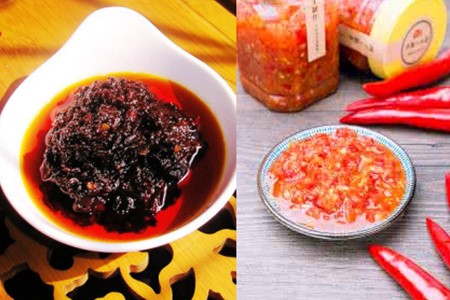 掌握了基础款的辣椒酱,我们就可以开始尝试自己动手做一些其他口味的辣椒酱啦。比如左图的这种辣椒酱,它的准备材料就比基础款多了味精、甜面酱和白糖。做法是:辣椒洗净剁碎后放入油锅里炒,火量自由调节。翻炒的过程中需要不停搅拌,逐步加入盐和白糖。油透出来后加入甜面酱,然后熬制十分钟左右。辣椒和酱充分融合后可选择加味精或者不加。