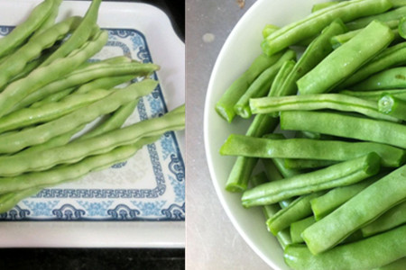 准备好新鲜的四季豆以及鲜猪肉,四季豆洗干净后切成四厘米左右长度的豆角段,因为豆角不容易被做熟,如果单一用明火烹煮会很耗时,而且浪费精力。可以将豆角段放进微波炉内高温加热,去除多余水分的豆角口感会更好。微波炉内大火加热至豆角段外皮呈现干皮为好,这样在煸的过程中也很省力,把豆角从微波炉内拿出时小心不要被烫到。