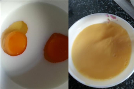第一步:在碗中倒入适量的牛奶,并在里面打两个鸡蛋,用打蛋器搅拌均匀,放在一旁备用。
