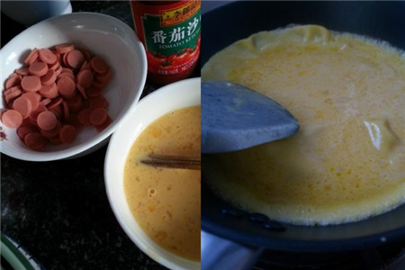 第三步:在油锅里放适量的油,把鸡蛋和牛奶的混合物倒进锅里,开始煎蛋包饭的鸡蛋皮,这一步特别关键,因为影响到了整个蛋包饭便当的外观和口感。我们将蛋液放入油锅里,摊平,煎的火候不要太旺,中火左右就可以。如果掌握不好火候,可以用小火慢慢地来做。