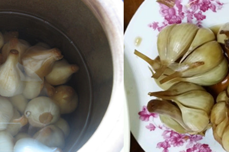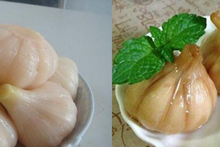 大蒜经常被做成糖醋蒜,制作方法也很简单。糖醋蒜经常为长江以北的居民食用,取白皮蒜两斤,去除茎叶和外皮,一般以剥掉两层外皮为宜。洗干净的白皮蒜放置清水中浸泡,可以浸泡一个星期,但是每天都要换一次清水,切记每次换水时都要把蒜晒干到表皮呈现褶皱的状态为宜。这样浸泡到第七天,把二两白糖用八两的白醋冲调,加适量精盐。