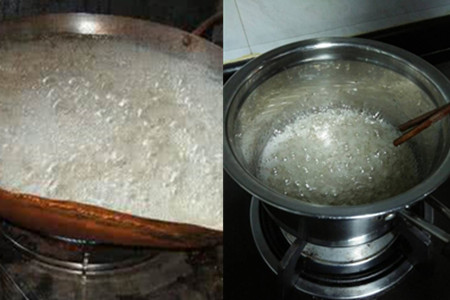 下一步就是很重要的炒糖环节了,糖炒的好不好决定了我们冰糖葫芦的质量高低。将冰糖和水按照一比一的比例混合,开大火加热,当我们看见锅中已经开始往上冒大泡的时候就要转为中火熬制,时不时搅一搅,确定不粘锅。大概两分钟分钟后就转为小火继续刚才的步骤,直到全过程过去十到十五分钟,立马将锅离火,进行下一步。