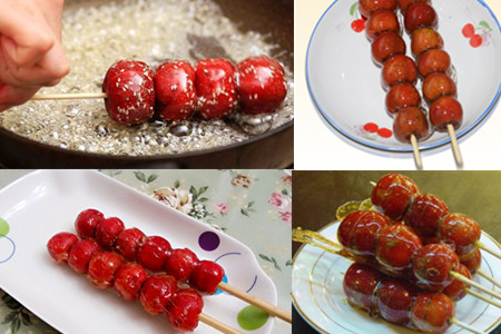 接下来就是如何好的蘸糖了。很多人有一个误区,那就是以为冰糖葫芦是把糖浇在山楂上做成的,其实并不是这样。有的聪明人知道冰糖葫芦是要用串好的山楂去蘸糖,但也会误解为把整串山楂伸到糖里面裹上一层糖,那么到底怎样裹糖呢?