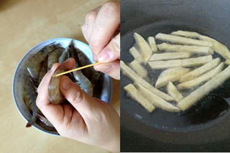 在锅中放入适量的油,油温加热后把花生米放入锅中油炸,炸至金黄就可以捞出沥干油。再将土豆切成长条状,同样放入油锅中油炸片刻。把腌制好的鲜虾放入锅中炸至表面呈现金黄的色泽后,捞出沥干多余的油脂。
