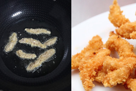 裹好淀粉的鸡柳放置半小时,这样它的味道更好一些。锅内倒入大量食用油,准备开始炸鸡柳,待油温升高,取一根鸡柳放进锅中试试温度,如果油花比较大就可以慢慢把鸡柳全部放进锅内,注意不要被烫伤。等到鸡柳炸至外表变成金黄色就可以准备出锅了。