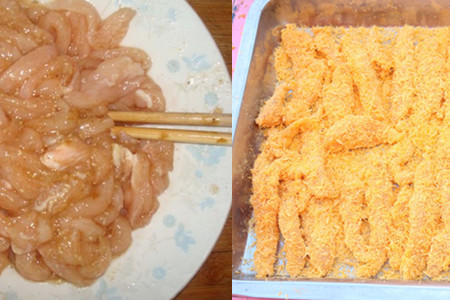 其实自己动手炸鸡柳也很方便,主要步骤在于如何腌制出美味的鸡柳。尽量买新鲜的鸡胸肉,不要买超市冰冻的。鸡肉买来后洗干净,然后把水分沥干,再把鸡肉切成一厘米宽的长条备用。取适量的孜然粉、胡椒粉、精盐以及耗油放进装有鸡柳的碗里,再加一点儿白糖,有提鲜的作用。搅拌均匀后再加入生淀粉,尽量让每一根鸡柳的外表都裹上淀粉。
