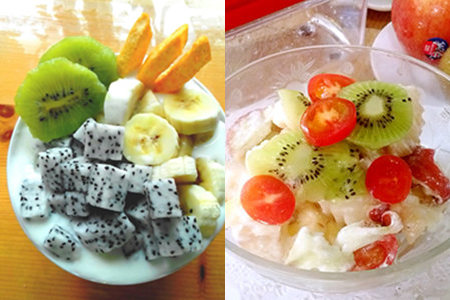 第三步:将所有的准备的水果放入一个干净无水的大玻璃杯中,按个人口味加入适量的沙拉酱,可搅拌均匀,也可直接蘸酱来吃。