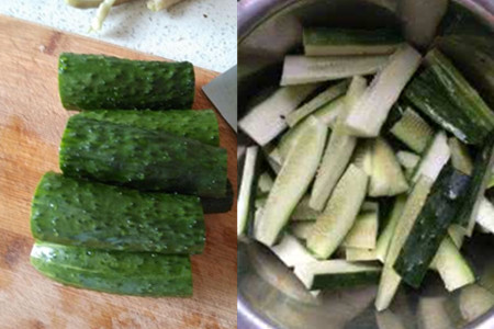 很多人表示用来腌制的菜便宜的也可以,其实不然,在腌制过程中一旦变质,那整个过程的努力都白费。新鲜的黄瓜洗干净,尤其要把外表的小刺洗掉。切掉前端和末尾,只选取中间完整的部分,放在一个比较大的盆子里,上面撒一些盐,粗粒的碘盐就可以,用双手搓黄瓜,有盐分大的存在可以让黄瓜中的水分很快出来。经过用盐搓的黄瓜外表变得比较皱。