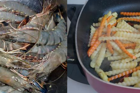 大虾洗干净后要把虾线挑出来,这些虾线里含有对人体有害的物质,所以无论做什么虾类的菜肴都要把虾线挑出。准备一些自己喜欢食用的青菜,特别是土豆、胡萝卜以及香肠是必不可少的,还可以选一些油菜、小白菜等蔬菜。将土豆和胡萝卜洗干净后切成条状,放进油锅中炸至八分熟,将其他青菜和香肠切成段,沥干水备用。