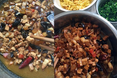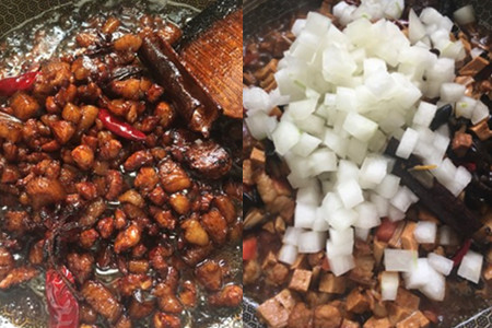 二、热油后把切小丁的五花肉和辛香料爆炒,等到肉沫发白以后,加入老抽翻炒片刻,添水没过五花肉,小火慢炖将肉煮熟。