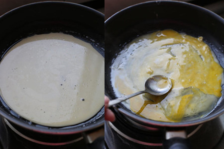 四、还是不开火,舀一大勺面糊进平底锅里,慢慢转动锅子让面糊流开,均匀铺满锅底。