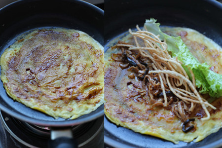 八、平底锅余温继续煎煎饼,涂抹酱料,加上油条和生菜卷起来,煎饼果子就做好了。
