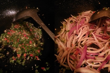 第四步,锅中加入适量的食用油,加热后,放入切好的洋葱丝,转至大火迅速翻炒,等到洋葱半熟之后,加入事先炒好的肉丝。
