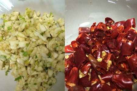 三、等待四季豆晾干的过程中,可以处理辛香料,剥半头蒜切成碎丁,干辣椒切成小段。
