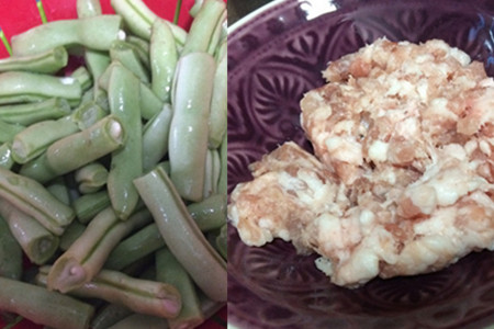 五、将四季豆盛出,锅内剩少许油煸炒猪肉馅,等到肉沫成为金黄色盛出备用。