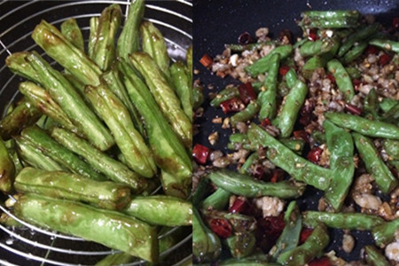 上面的做法可以看出来,干煸四季豆是不需要焯水的。热油能够很快的使四季豆断生,去除毒素,焯水处理以后会失去干香的口感。