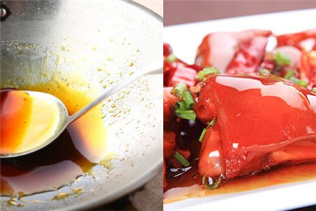 在煮猪蹄的时候我们来进行关键步骤:如何给猪蹄上色。这里因为没有用酱油,所以我们用冰糖来进行炒糖色。先在锅中加入食用油,开小火加热,加入冰糖。一般加热一边搅拌,等冰糖全部融化后,继续加热,不过这时候不需要搅拌了。等糖水慢慢从无色变成棕褐色就可以了。将糖色加入到猪蹄汤中去,开大火收汁即可。【女物原创未经允许,谢绝转载!】
