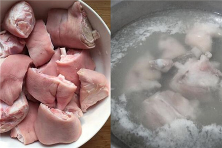 将新鲜的猪蹄去除上面猪毛,一定要去干净不然影响口感。将猪蹄洗干净剁成块状,放入沸水中汆烫10分钟,捞出再次洗干净。在锅中烧水将猪蹄放入闷煮,水开后加入生姜、葱和料酒(去除猪蹄的腥味)。开小火闷煮1个小时左右,加入桂皮、八角等香料,再闷煮1个小时等猪蹄酥烂。