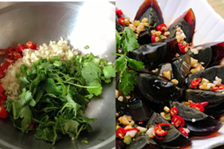 将剁碎的蒜蓉和香菜洒在切好的皮蛋上,浇上刚刚调好的调味汁即可。