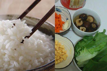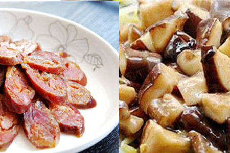 第二步:用开水先泡香菇,然后将萝卜、红萝卜、地瓜分别切丁,腊肠切成片状装盘待用,青菜切成一指长短更容易入味。