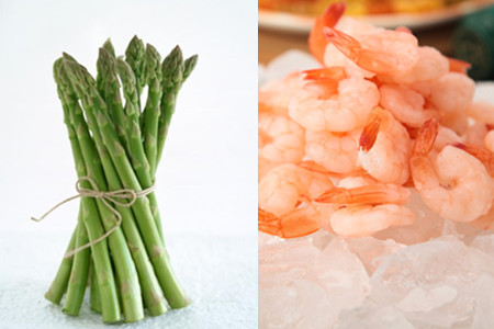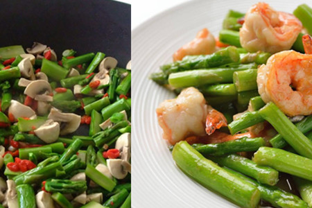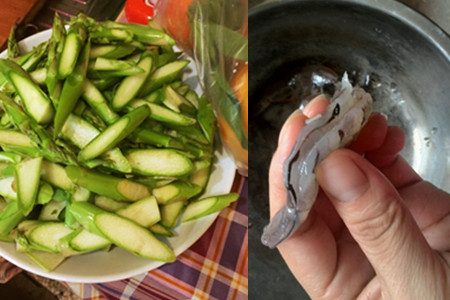在处理芦笋的时候,我们需要将它底部的硬根去掉,否则它的硬根便会影响整道菜的口感。之后,我们便可以用刀将它切成片状。在这里需要注意的是,我们在切的时候尽量将它切得薄一些,因为这样会缩短炒制的时间。之后,我们需要将大虾煮熟,同时再将它拨去虾壳并用牙签将它背部的虾线慢慢挑出来。