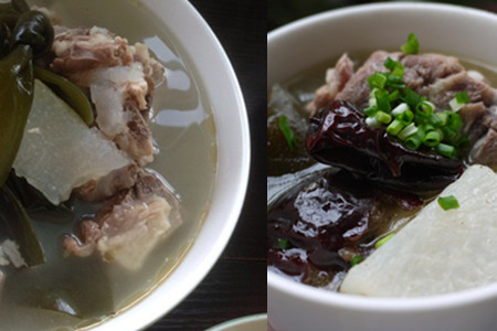 第四步,将排骨,白萝卜块,海带一起放入锅中,炖煮一个小时。根据个人口味加盐后即可食用。