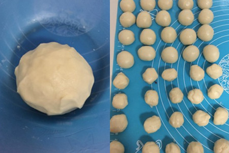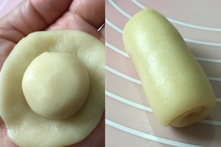 四、将油皮与酥皮均匀分成十六份。然后依次把油皮擀成圆形,包进油酥,捏紧滚圆,收口朝下。注意要将两部分完全贴合,不要有空气存留,不然开酥过程中容易破皮。
