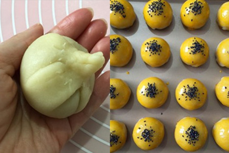 六、将油酥皮小圆柱对折后擀成圆形,包入处理好的蛋黄馅,收口滚圆。表面刷鸡蛋液的,点黑芝麻,均匀的放在烤盘内。