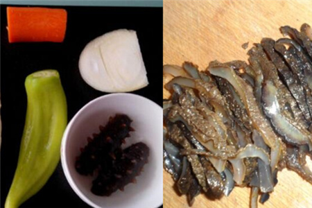 海参我们采用是完整的淡干海参(营养价值高不容易参假口感更佳),所以需要提前泡发。一般需要泡发24小时左右,将泡发好的海参放入沸水中焯一下,捞出沥干后切成细丝备用。