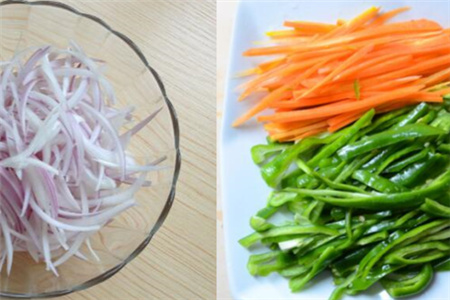 面条烧水煮熟,捞出去除水分后放凉备用(可以适当加入少量食用油搅拌一下防止面条粘在一起)。将胡萝卜、青椒和洋葱都切成细丝,加热油锅后放入生姜、大蒜头和葱爆香,将海参丝放入煸炒。加入料酒去除腥味(海参腥味较重可以适当多放一些料酒),再加入青椒丝、胡萝卜丝和洋葱丝一起煸炒。