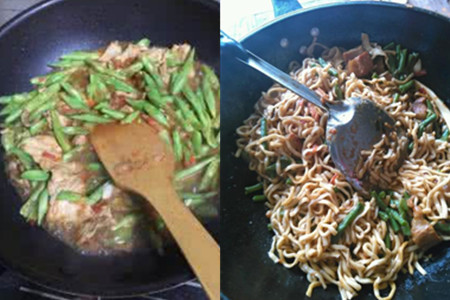 5、把一半的面条下入锅中,再淋上些许的酱汁。继续下入面条,把剩余的酱汁全部倒入锅中。中火煮至汤汁沸腾冒泡后,再改为小火慢慢收汁。收汁快结束时,用筷子稍微搅拌一下面条和豇豆就可以食用了。【女物原创未经允许,谢绝转载!】