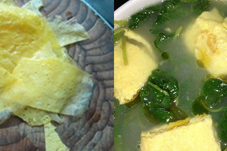 选择用小火将它慢慢煎成蛋皮,拿出来用刀切成大小合适的块状。还需要在锅里面倒入适量的水烧开之后,加入切好的蛋皮和空心菜。