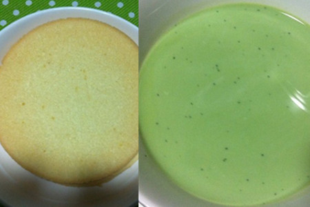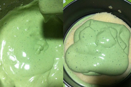 七、准备好慕斯模具,先倒入三分之一抹茶液,震平以后放入一片戚风蛋糕,再加入三分之一抹茶液,再放入一片戚风蛋糕。将剩下的抹茶液全部倒进模具,抹平表面。
