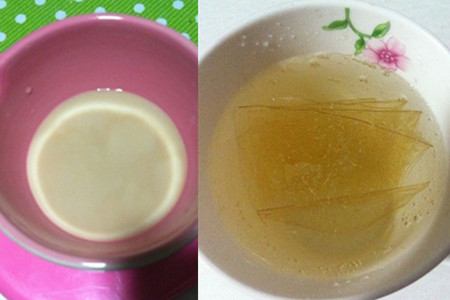 二、首先制作糖酒液,将水、白糖和百利甜酒混合在一起搅拌均匀备用。将两片吉利丁片泡在冷水里备用。