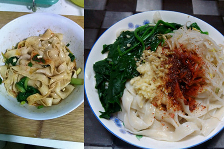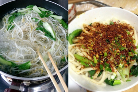 面煮好之后放进一个大碗里面,把葱姜蒜末以及辣椒放在上面,小白菜、豆芽以及花生也一起放进去。所以东西都准备好后,在上菜之前,把油烧热煮沸。煮沸后的油浇在面上,这样油泼面就完成了。你可以根据个人口味添加醋和酱油,醋会使面更加劲道,也更加开胃。【女物原创未经允许,谢绝转载!】