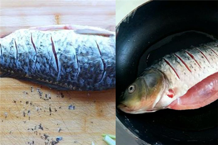 首先,我们先准备一条新鲜的鲤鱼,红鲤鱼会更好一些。把鲤鱼去掉鳞片,并在鱼身上切花刀,不用切的很整齐,交错切也可以。