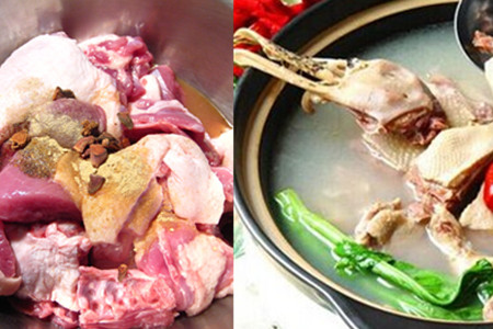 第二,起热水锅,先将鸭肉块入热水中焯一遍后捞起装入干净的盘里备用。