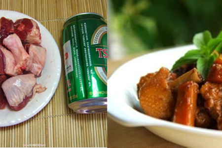 第四,待到鸭肉将熟时,下适量的啤酒,使其没过鸭肉面,再下盐和糖,轻微的搅拌一下后,将火调大烧滚后转文火煮上30min左右。