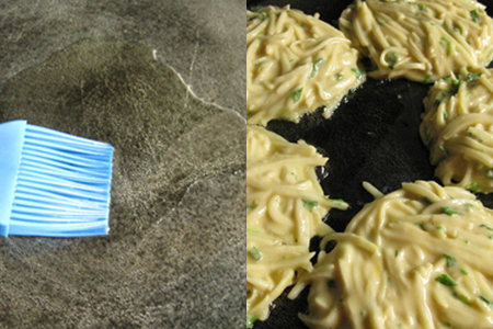 第八步:准备一口干净无水的平底锅,放入少许的油,涂抹均匀锅底,用中火热锅。