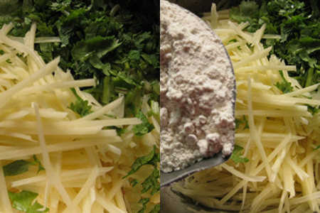 第六步:土豆丝用大碗装好,放入香菜碎,接着放入一茶匙的盐, 再放入面粉和清水,搅拌均匀。