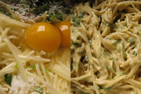 第七步:将鸡蛋液放入搅拌均匀的土豆丝粉,再搅拌均匀成面糊状。