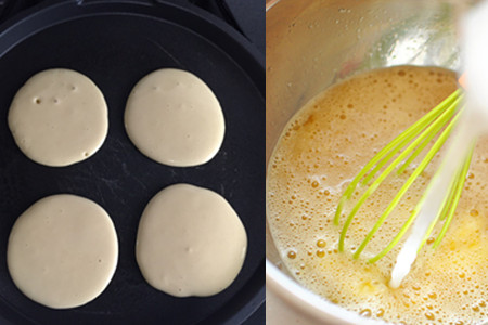 这时,我们便可以在煎锅上放入一些黄油,然后用勺子将事先搅拌好的面糊倒入煎锅中。这时,我们一定要确保倒入煎锅中的面糊是圆形的。然后,我们等到它们表面起泡之后必须要将它们翻面,继续进行煎制。在它们两面煎至金黄的时候,我们便可以将它们拿出来。