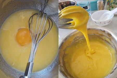 用橡皮刮刀不停地翻搅蛋黄等混合物,待其成蛋黄糊后停止搅拌。