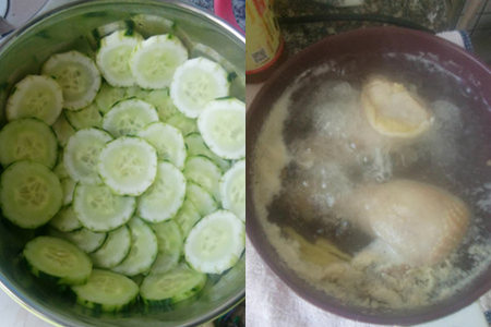 第五步:热好油锅之后,放入腌制好的鸡肉,用大火翻炒五分钟,放入三茶匙的清水,盖锅等两分钟,煮好的鸡肉放在摆好的青瓜上面。